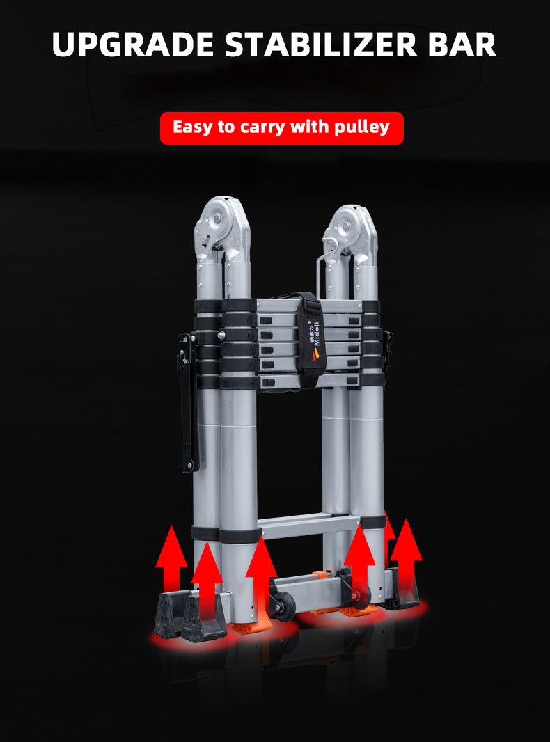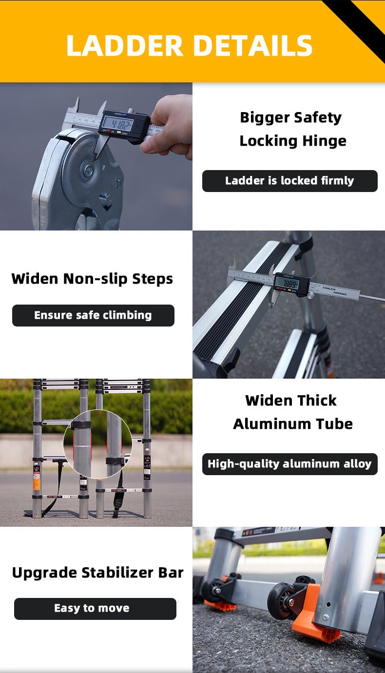 【PREMIUM MATERIAL】The Telescopic Extension Ladder is crafted from high-quality aluminum alloy. It’s lightweight and easy to carry without sacrificing strength.