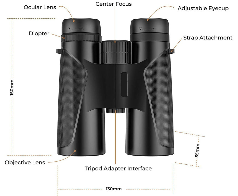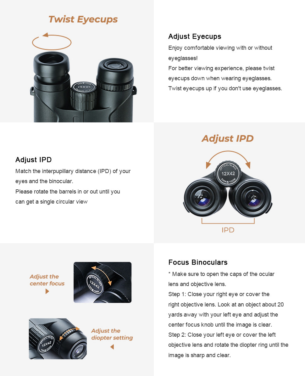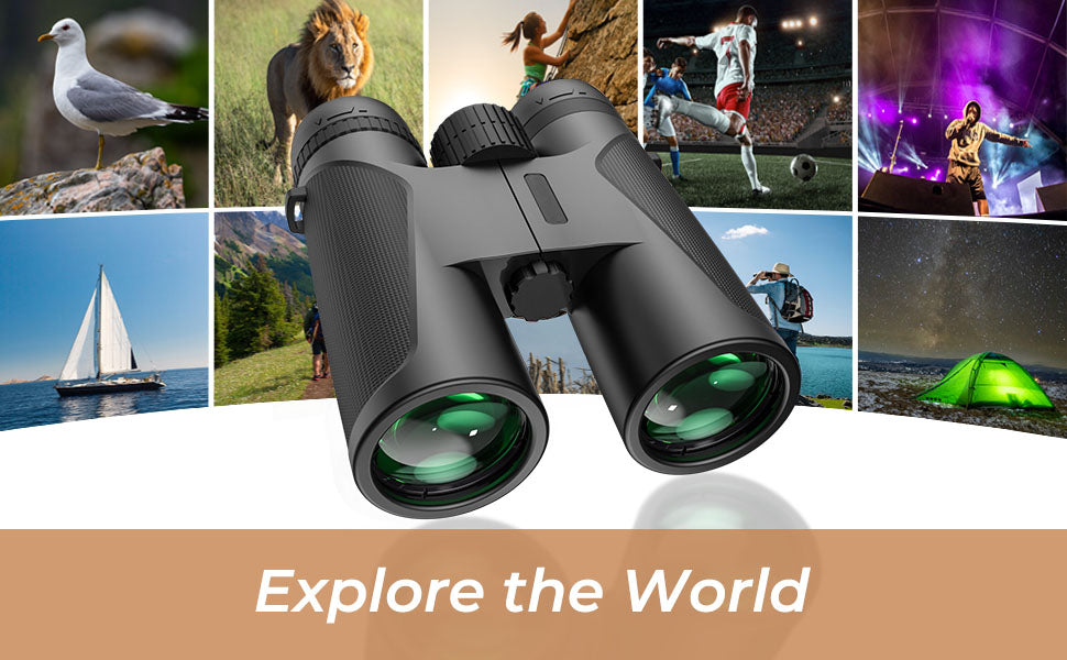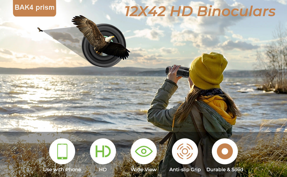 With BAK4 prism and green FMC optical coating, these 12X42 HD binoculars offer crisp and sharp images, suitable for various events, like bird watching/ concert/ sports/ hiking/ hunting/ stargazing. These solid build binoculars are also easy to focus and comfortable to view, making them perfect gifts for adults and teens to meet their curiosity and explore the world.