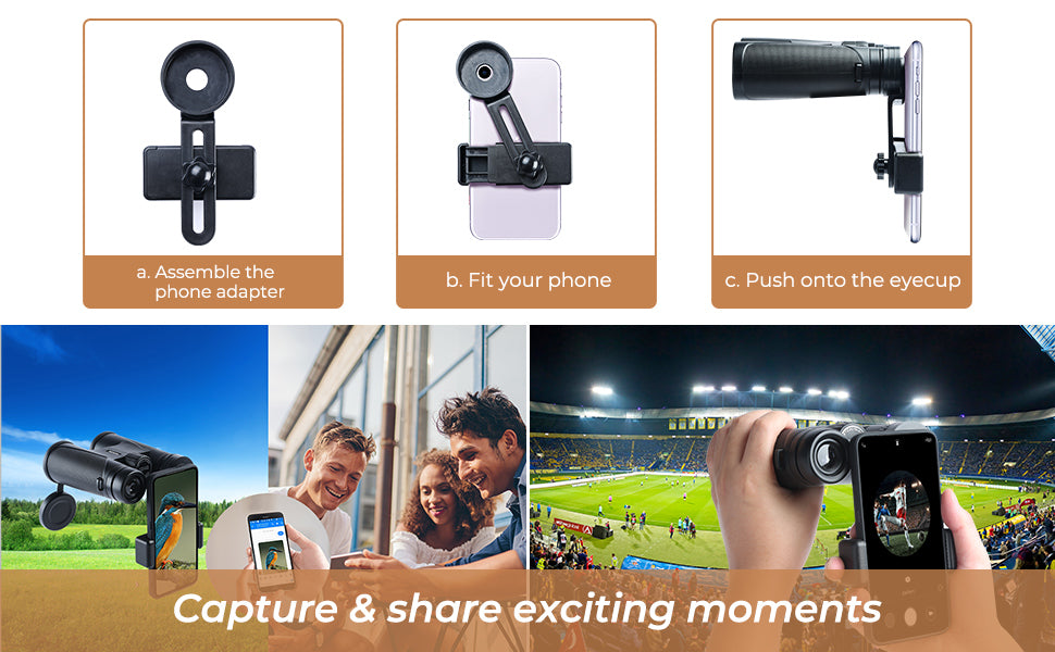 【Capture & Share Exciting Moments】It comes with a phone adapter and a tripod-ready clip for you to capture what you see from the binoculars. The phone adapter fits most phones between 2.28 and 3.07 inches wide, such as iPhone X/8P/8/7P/7/6/6s/6P/5/5s, Samsung GALAXY S8/S7/S6/S6 Edge/S5/Note, LG, HTC, Sony, Etc. Prepare a solid universal tripod yourself to stabilize your phone shooting for better pictures.