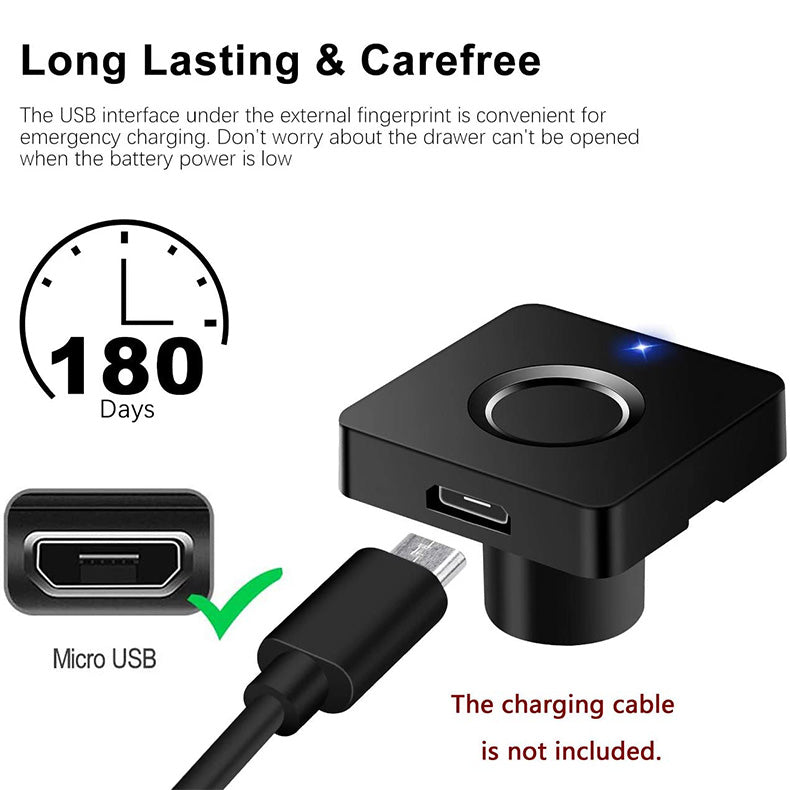 【Rechargeable & Humanized Design】: The cabinet lock adopts rechargeable design, USB charging interface, convenient and easy to use. USB interface is designed under the external fingerprint, convenient for emergency charging. Low power consumption, it can last for about 180 days after fully charging