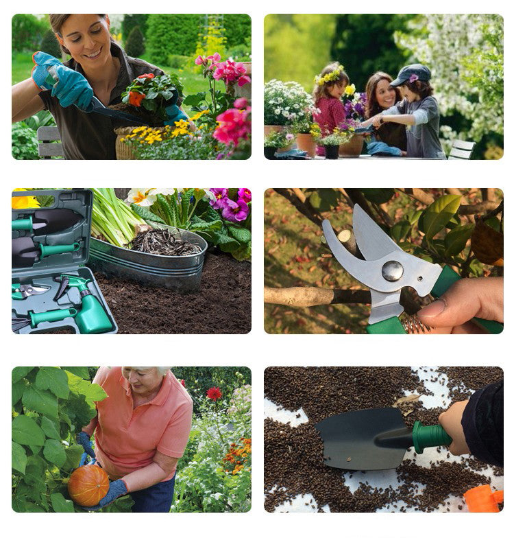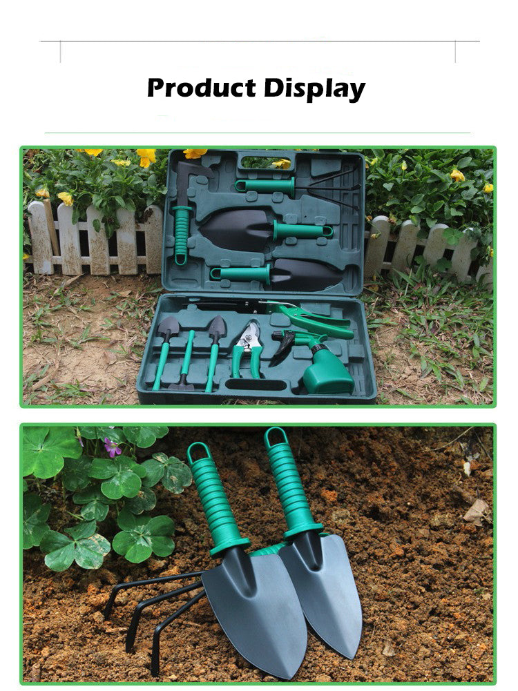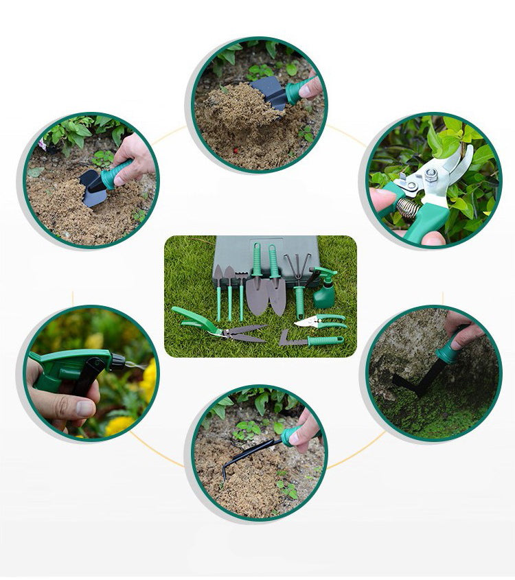 【EASY TO CARRY】 -- The garden combination set is made of Iron material, lightweight and small. With a molded shell tool box with slots for easy storage and classification. The engineered handle provides a matte handle that relieves pressure on the wrists and hands.