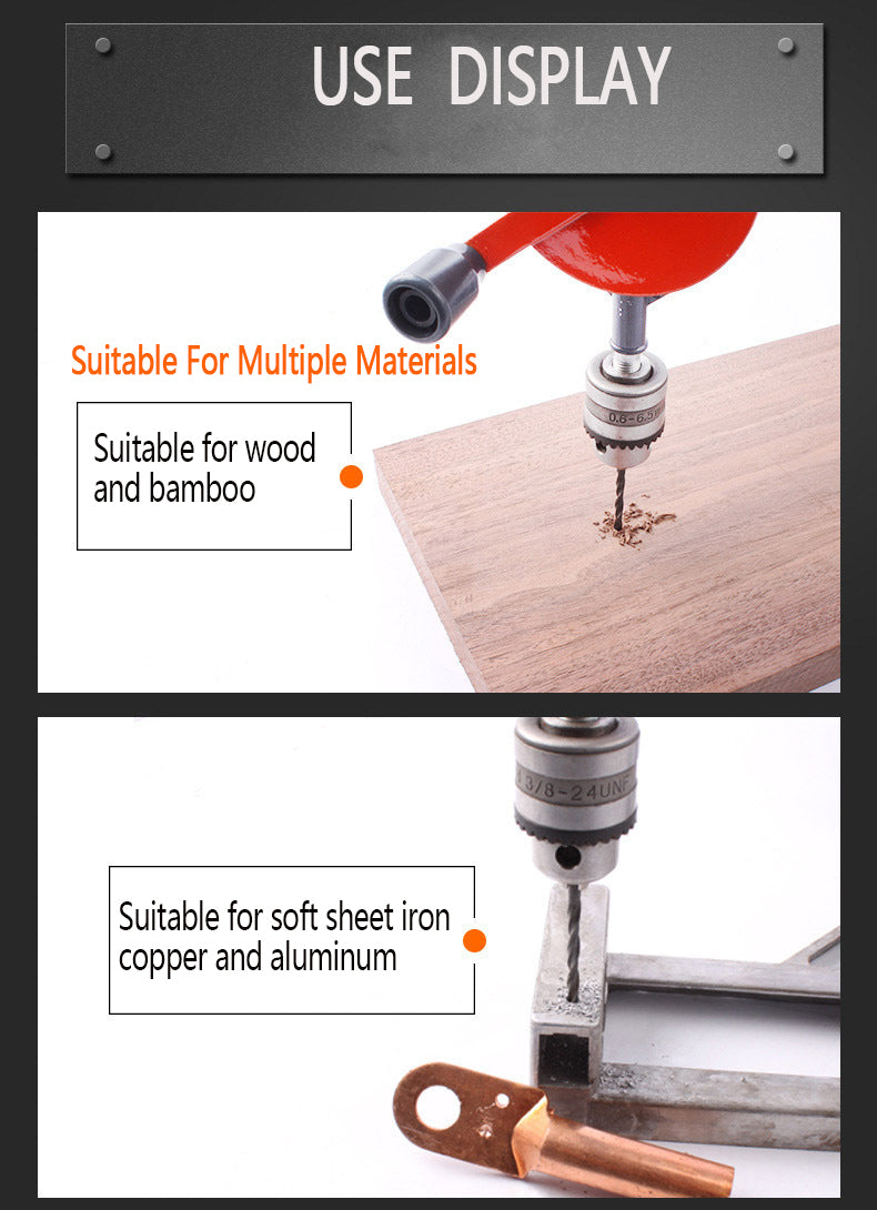 This multi-functional hand drill is made of 45# steel, and the gear is precision cast, with high precision and durability. Wide application range, this manual drill is suitable for various materials, such as wood, bamboo, copper, aluminum, plastic, PVC, acrylic, fiberglass board, circuit board, etc.