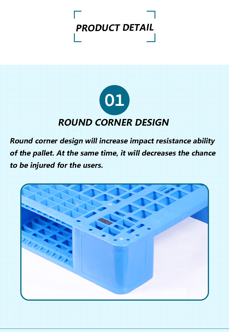 [Round corner design]: This pallet utilizes round corner design which will increase impact resistance ability of the pallet. At the same time, it will decreases the chance to be injured for the users.