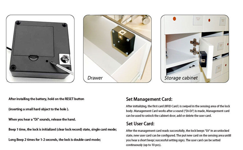 【One Key For Multiple Locks & Android IOS NFC Unlock】The only thing you need to do is to program the key into several locks as you want and test it before installation. You can use one key (RFID card/fob) to unlock several cabinet locks without touch. (Frequency 13.56mhz)【NFC Setup】For Android, copy your RFID key to your smartphone's wallet via NFC function. For IOS, add a new transit card at apple wallet and then program the transit card to your lock as a NFC access card.