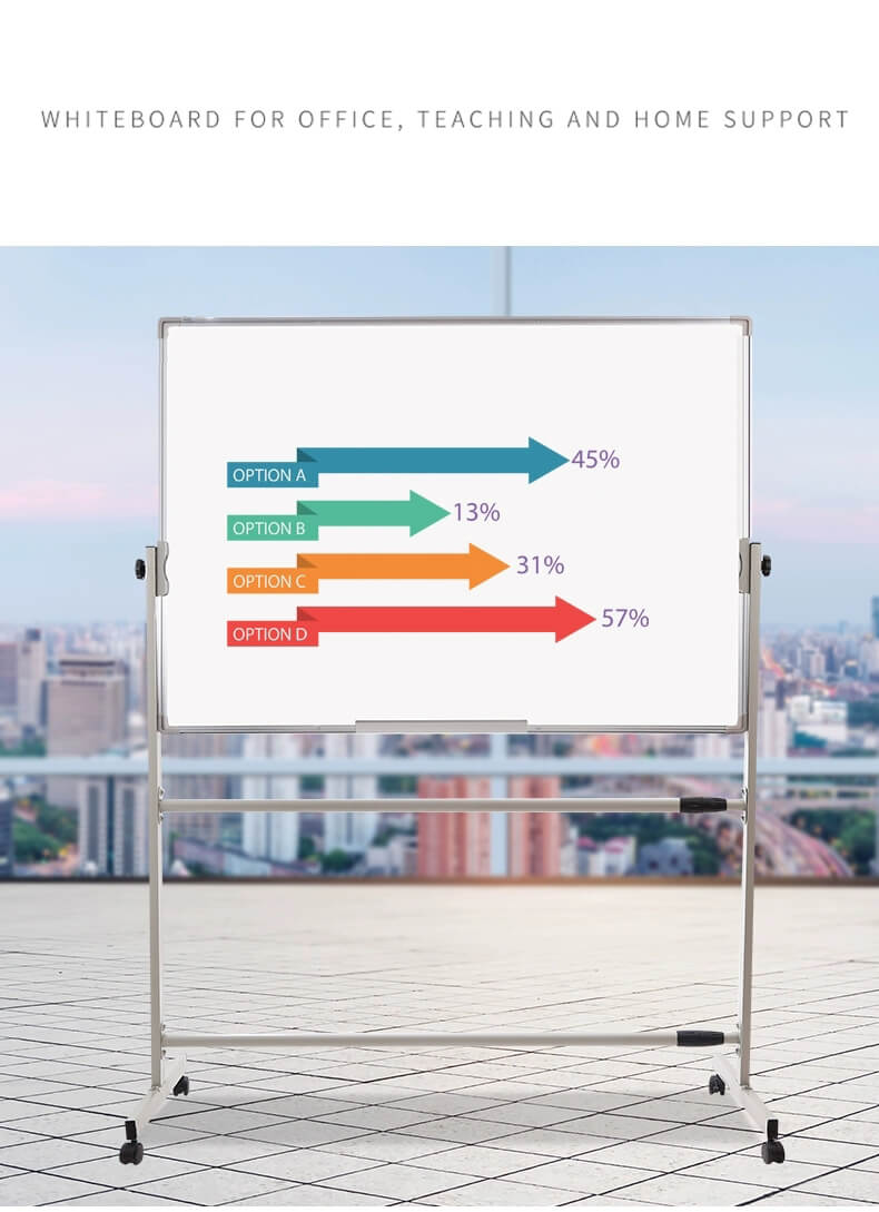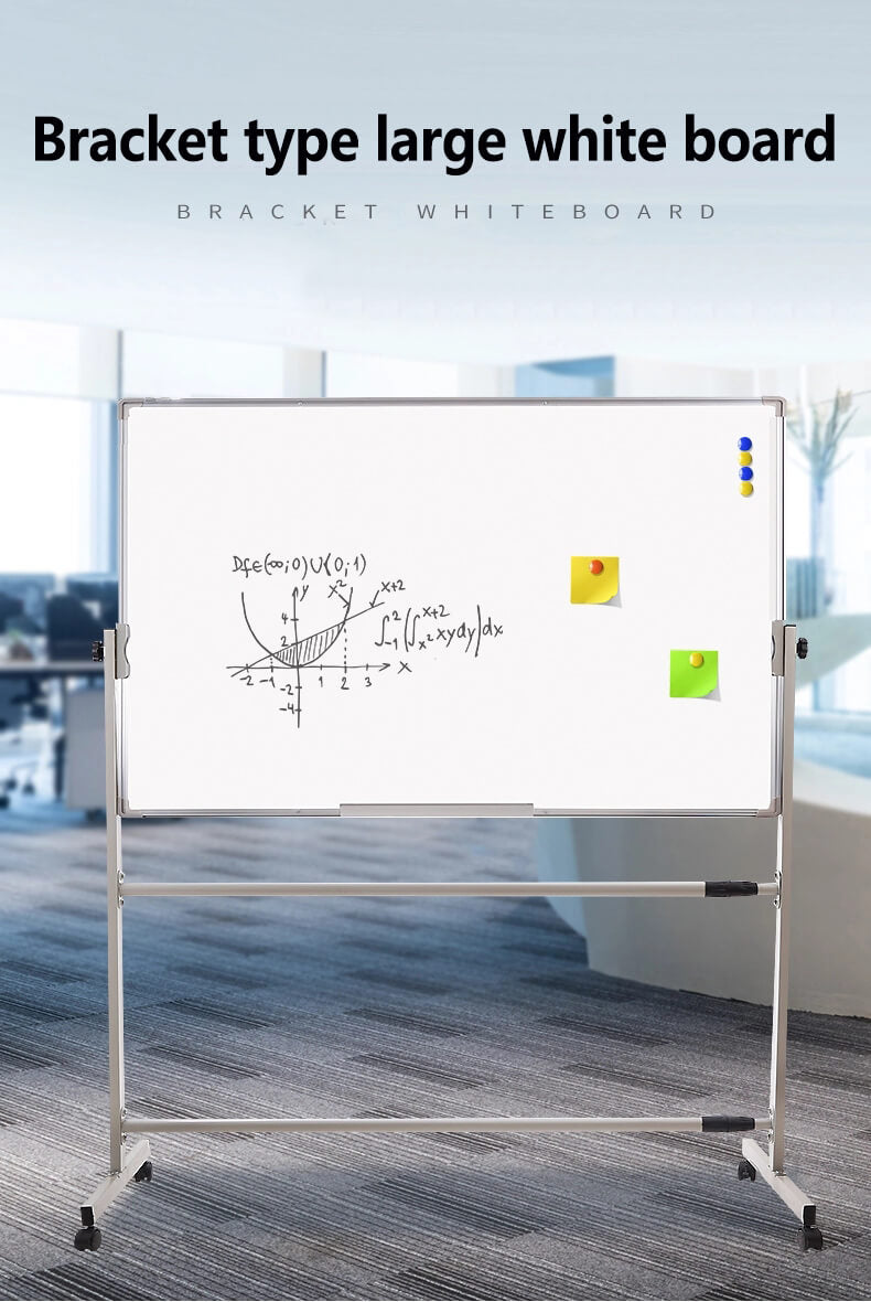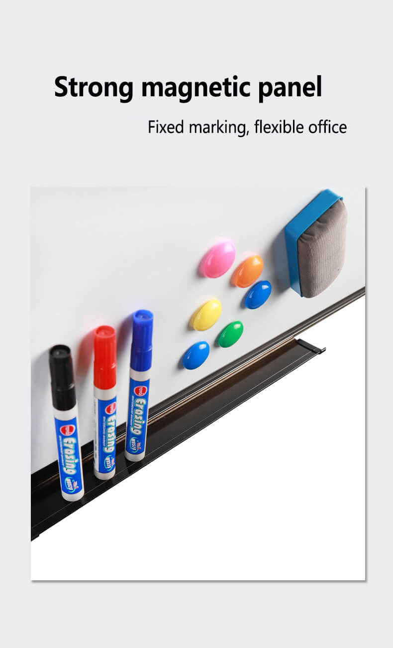 This support type writing board has excellent texture and is widely used. The panel adopts a three-layer paint panel, which is easy to erase and write. The frame is made of high-quality aluminum alloy material, which is stable and firm. It is suitable for families and children's counseling, conference room content display, teachers or training institutions.