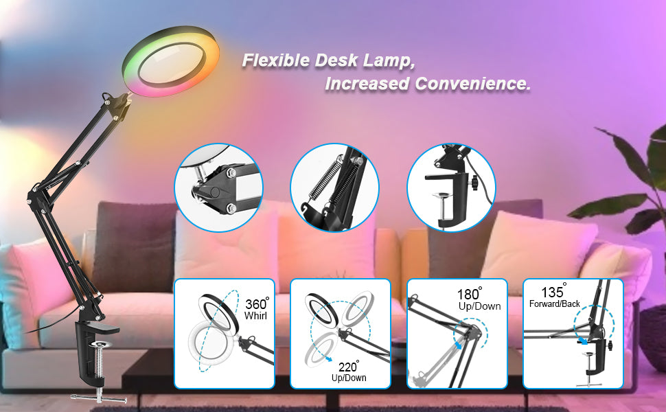 Swing Arm Magnifying Lamp: The glass lens can be adjusted 220° up and down, and 350° swivel. Provide you with greater flexibility. There has 3 knobs&4 springs to keep arm stable, free your both hands. Suitable for repairing electronics, soldering, crocheting, painting, jewelry, facial, manicure, puzzles, etc.