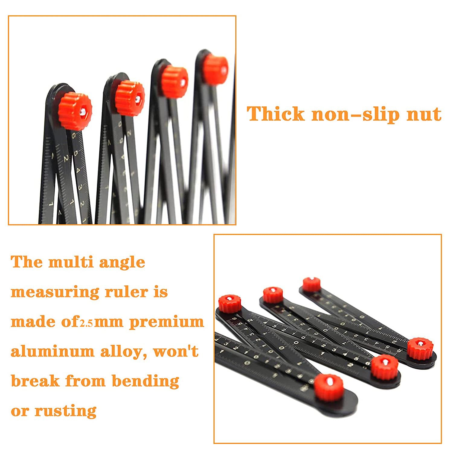 DURABLE ALUMINUM ALLOY METAL MATERIAL: This multi-angle measuring ruler is made of 2.5mm premium aluminum alloy, won't break from bending or rusting, more durable and sturdier than the plastic one. Say no to your fragile template tool.