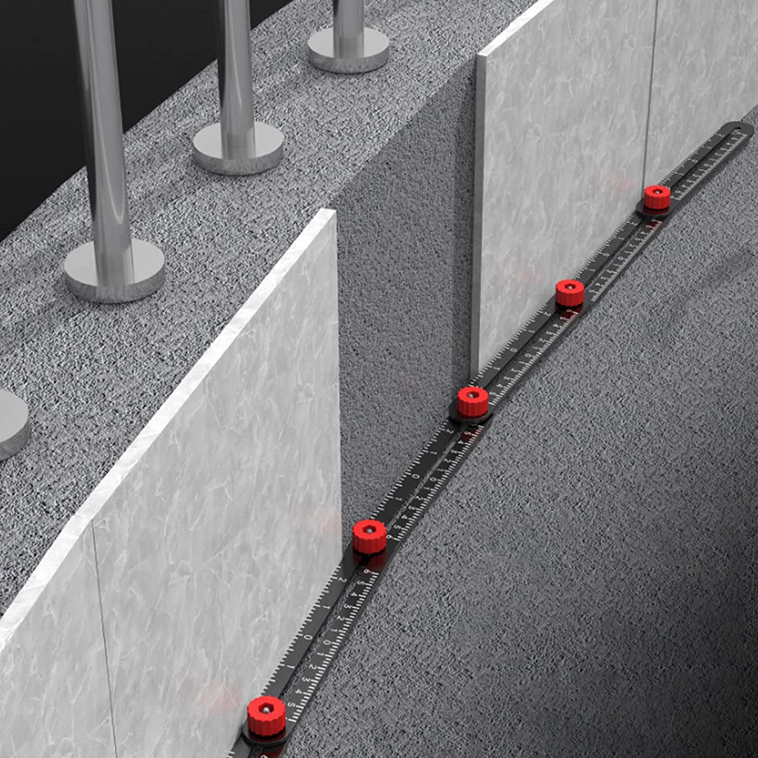 EASY TO USE:1. Find the hole position and tight all the knobs. 2. Move the ruler onto the tile and mark the hole. 3. Drill a hole at the place you marked. 4. Put the tile onto the wall.